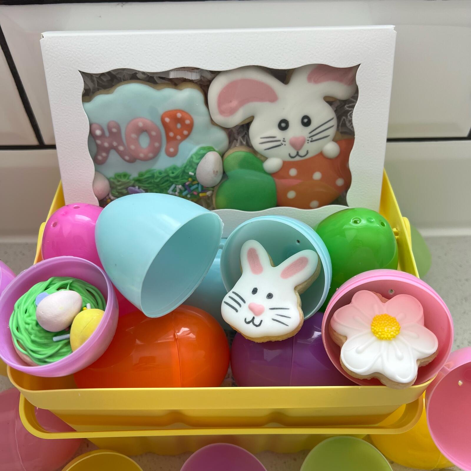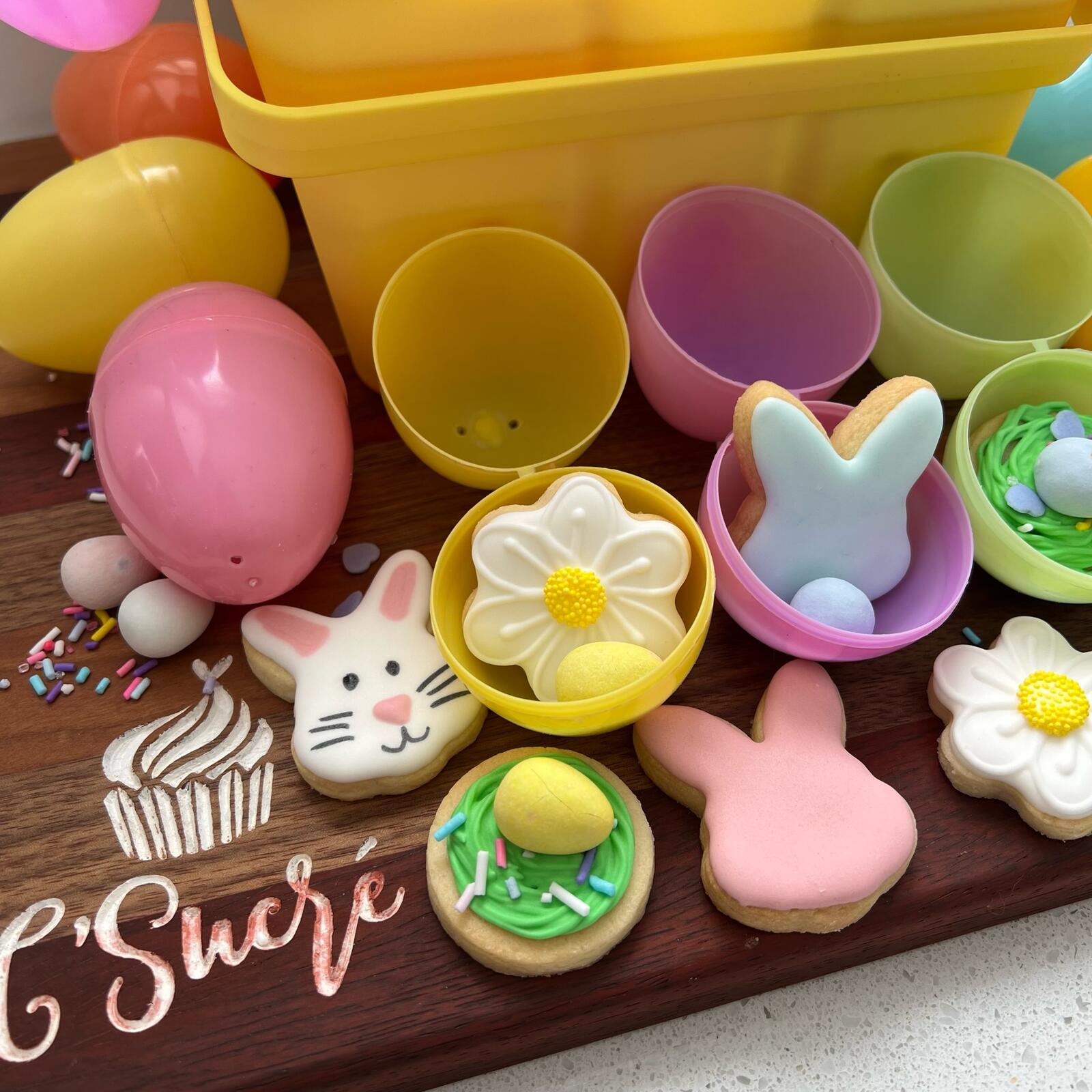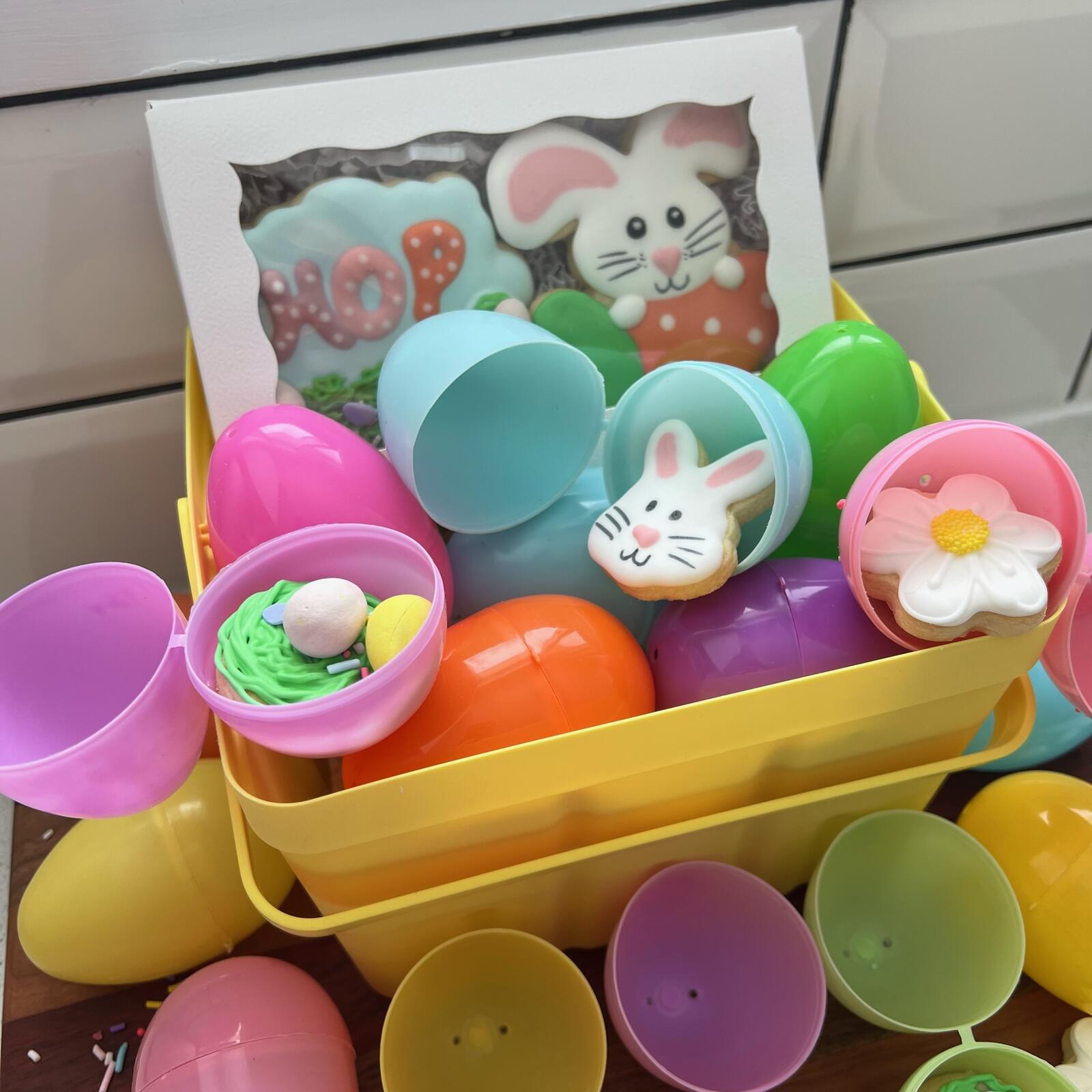 • 12 reusable plastic Easter eggs, each filled with a mini decorated cookie and a mini egg chocolate